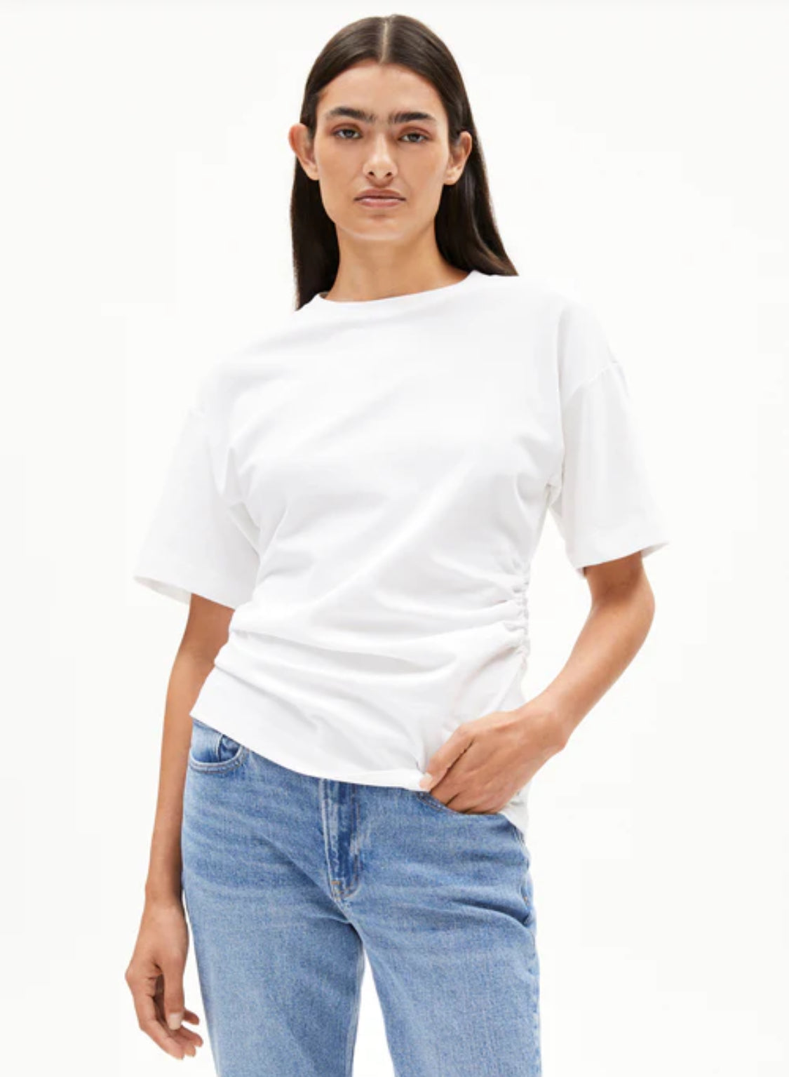 Gorgeous heavyweight cotton tee with side ruching detail and beautiful sleeve length. Wear alone or layered under cozy sweaters, coats, and vests this upcoming fall/winter season.